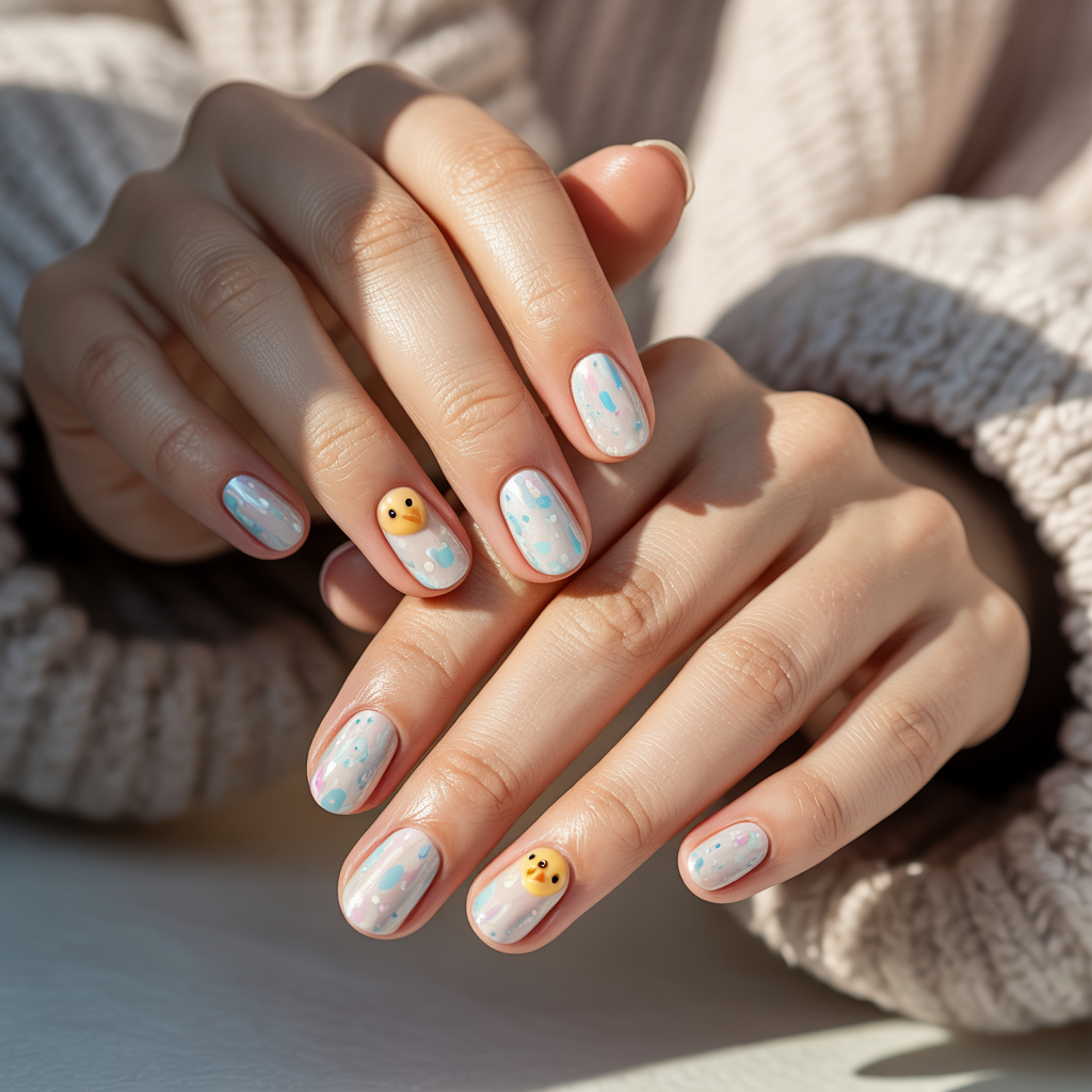 At first the nails look like speckled Easter eggs, but when you tilt your hand, a tiny chick appears under the curved nail tip. It’s subtle and interactive.