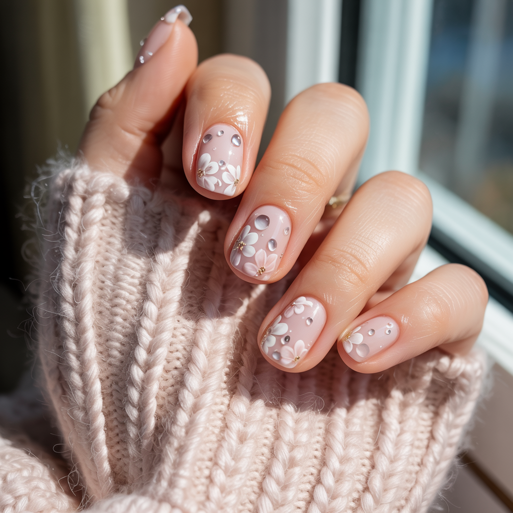 A soft blush or milky base topped with tiny pearl accents shaped like flowers creates a delicate spring blossom look matching all Easter 2026 dates gatherings.
