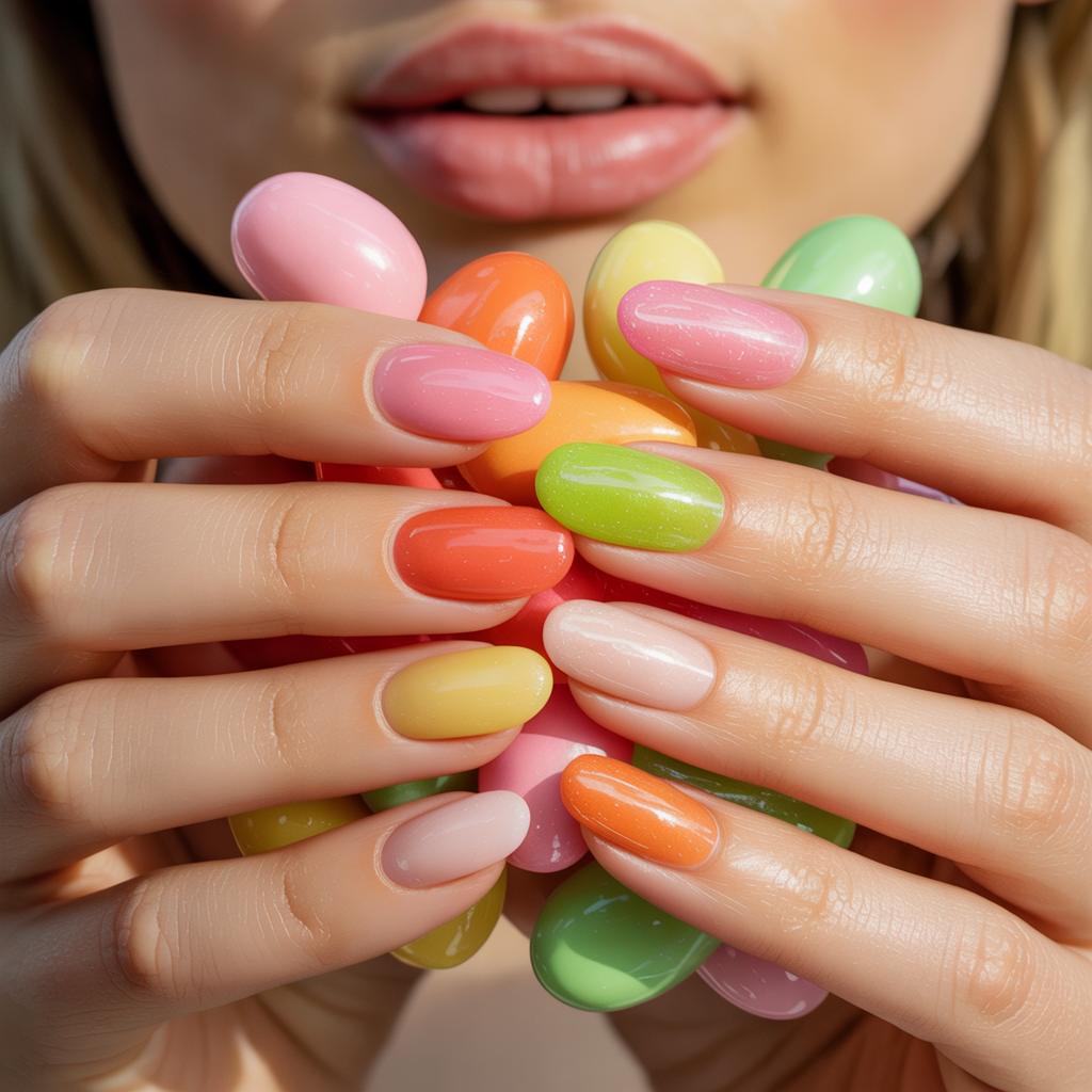Inspired by Easter candy, each nail uses a different transparent color like pink, orange, lime, or yellow. The glossy finish creates a glass-like jelly effect a rising Easter 2026 date beauty trend.