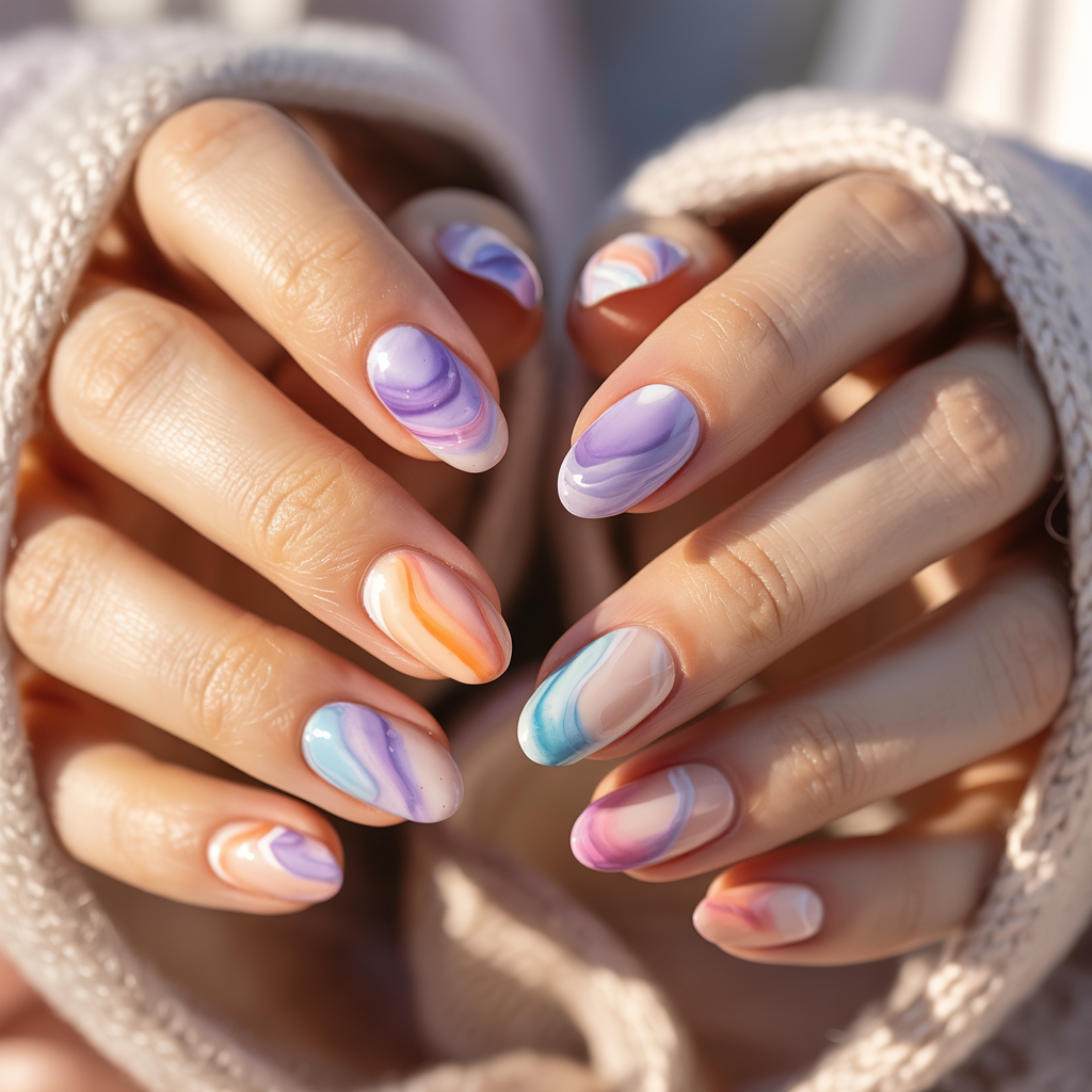 Each nail looks like a hand-painted Easter egg using soft watercolor swirls of lavender, peach, blue, and pink blended together.