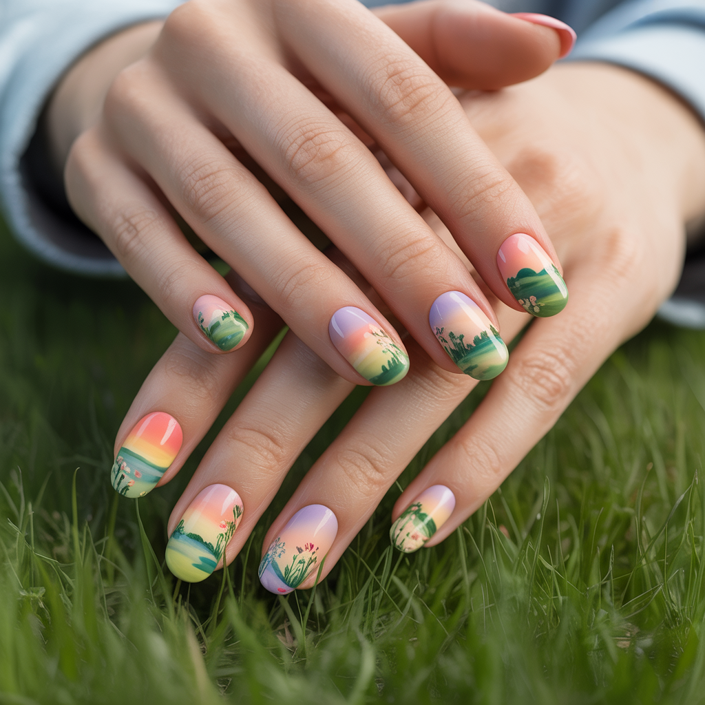 Tiny landscapes grass, flowers, and a sunrise sky are painted across the nails, turning your manicure into miniature spring artwork for Easter 2026 celebrations.