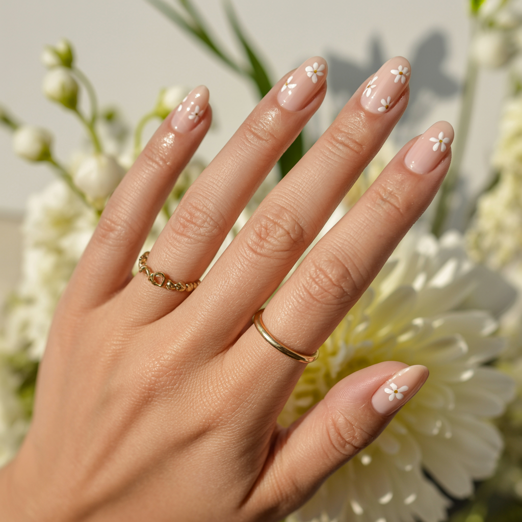 A soft nude base with three or four tiny hand-painted white flowers on one accent nail is the look that sits perfectly at the intersection of minimal and feminine. Not a full floral nail just a whisper of something pretty that makes a simple manicure feel personal and considered. In 2026, the most current version uses three-dimensional flowers built with thick gel tiny raised petals that add a jewellery-like texture and photograph beautifully. For the flat painted version at home, a fine nail art brush and white gel polish are all you need. Both versions look significantly more difficult than they actually are.