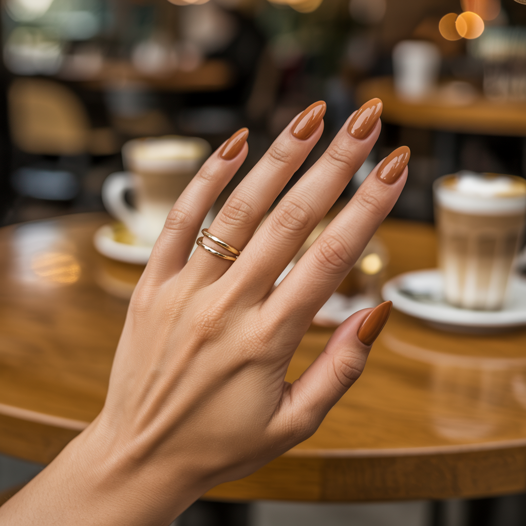 Caramel latte sits right between warm brown and soft beige the exact colour of coffee with a generous pour of cream and it has a rich, cozy depth that no other nude on this list replicates. It is deeper and warmer than most nudes, which means it functions almost as a neutral statement shade: clearly nude, but with enough personality to not disappear against the skin. On medium and olive complexions it is extraordinary the warmth mirrors the natural tone of the skin and the result looks completely intentional. It also photographs beautifully in autumn and winter light and pairs with the entire warm fashion palette.
