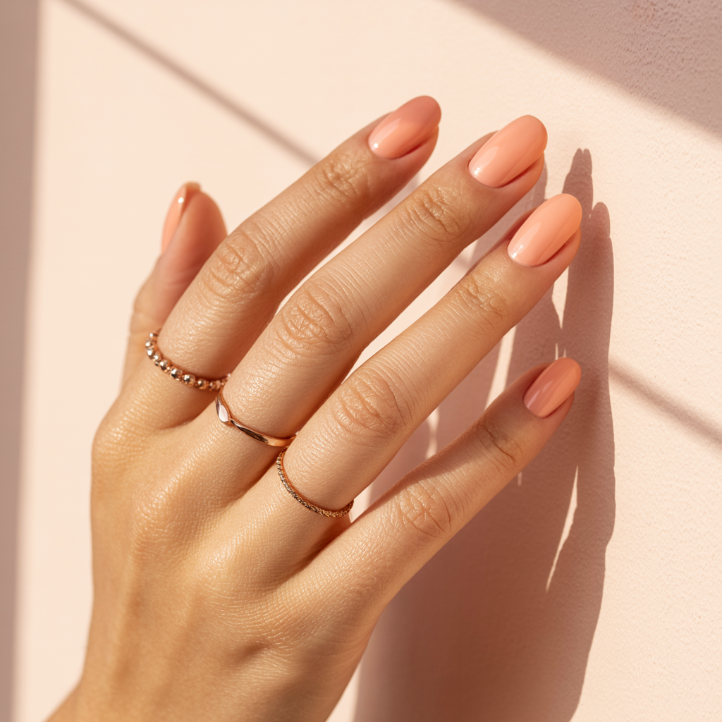 Peach nude does something that pink and beige nudes do not quite manage: it mimics the natural warm flush of healthy skin, which makes nails wearing it look more alive and well-rested than almost any other shade. It is the most underestimated nude on this list and one of the most flattering on warm and olive skin tones where the peach echoes the complexion’s natural warmth. The glossy finish is non-negotiable matte peach reads flat and dusty. Glossy peach reads fresh, warm, and radiant. The finish makes or breaks this shade entirely.