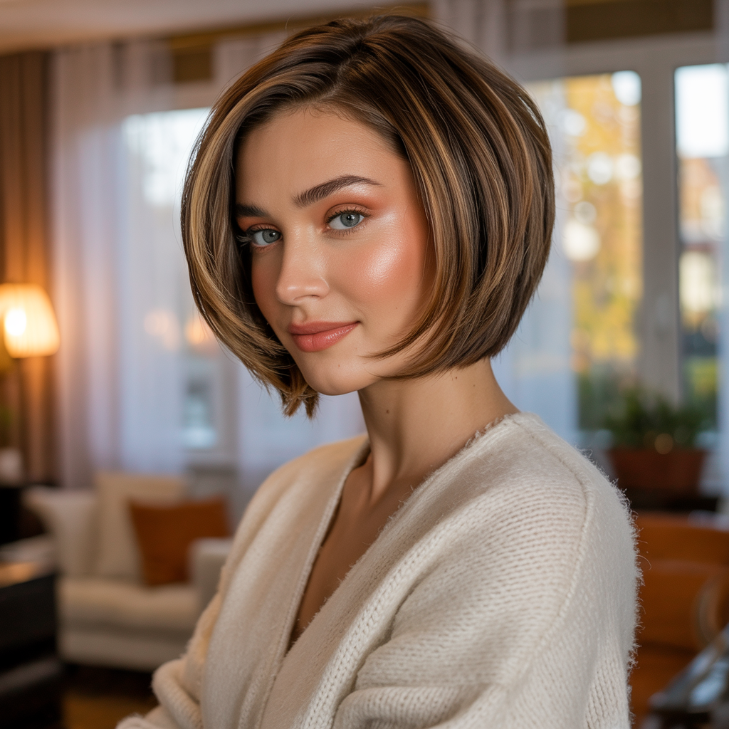 The stacked bob creates volume at the back while maintaining a sleek front. It’s structured and flattering for many face shapes. This cut feels polished and modern.