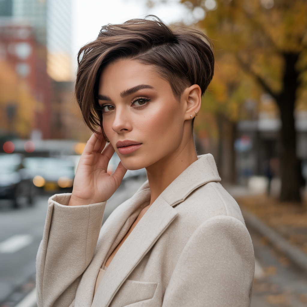 The pixie with undercut is bold and edgy for autumn 2026. It combines short textured layers on top with closely trimmed sides underneath. This contrast creates a strong silhouette.