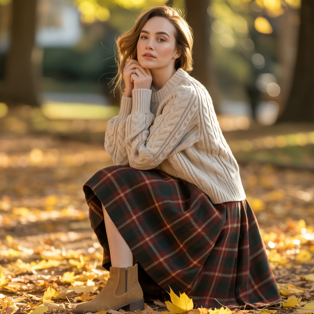 A chunky knit sweater paired with a plaid midi skirt creates a classic fall outfit that feels both cozy and polished. The soft knit balances the structured pattern of the skirt, while ankle boots complete the autumn-ready look.