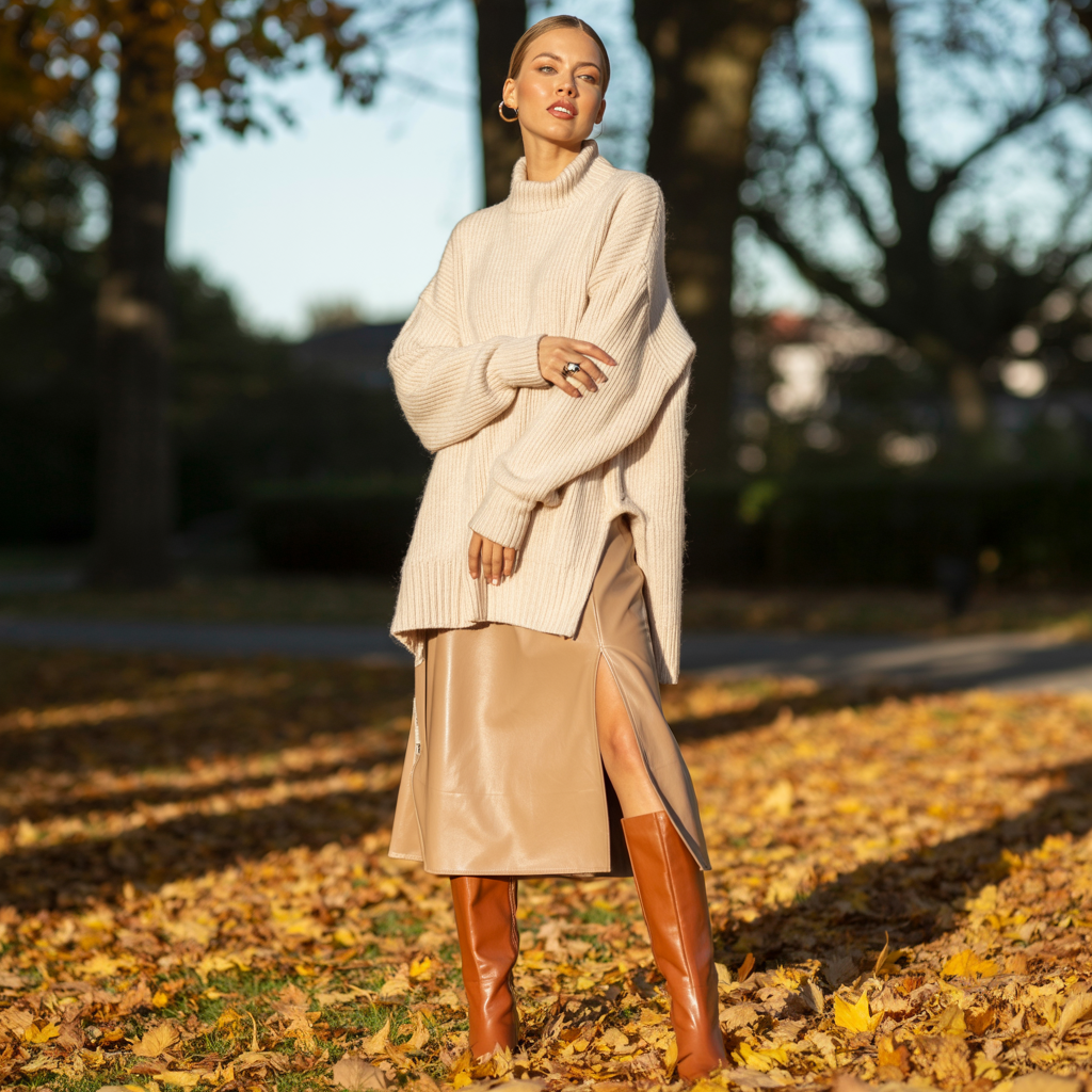 A fitted turtleneck combined with a leather mini skirt creates a sleek yet cozy fall outfit. The contrast between soft knit and structured leather adds depth and modern edge. Knee-high boots elevate the look while keeping it seasonally appropriate.