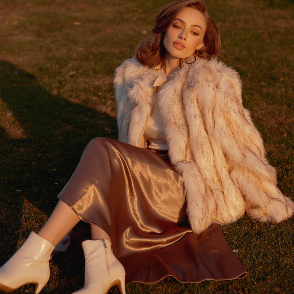 A satin skirt styled with a cozy faux fur jacket creates a glamorous fall 2026 outfit. The smooth satin contrasts beautifully with plush outerwear. Heeled boots add sophistication while keeping the look seasonal.