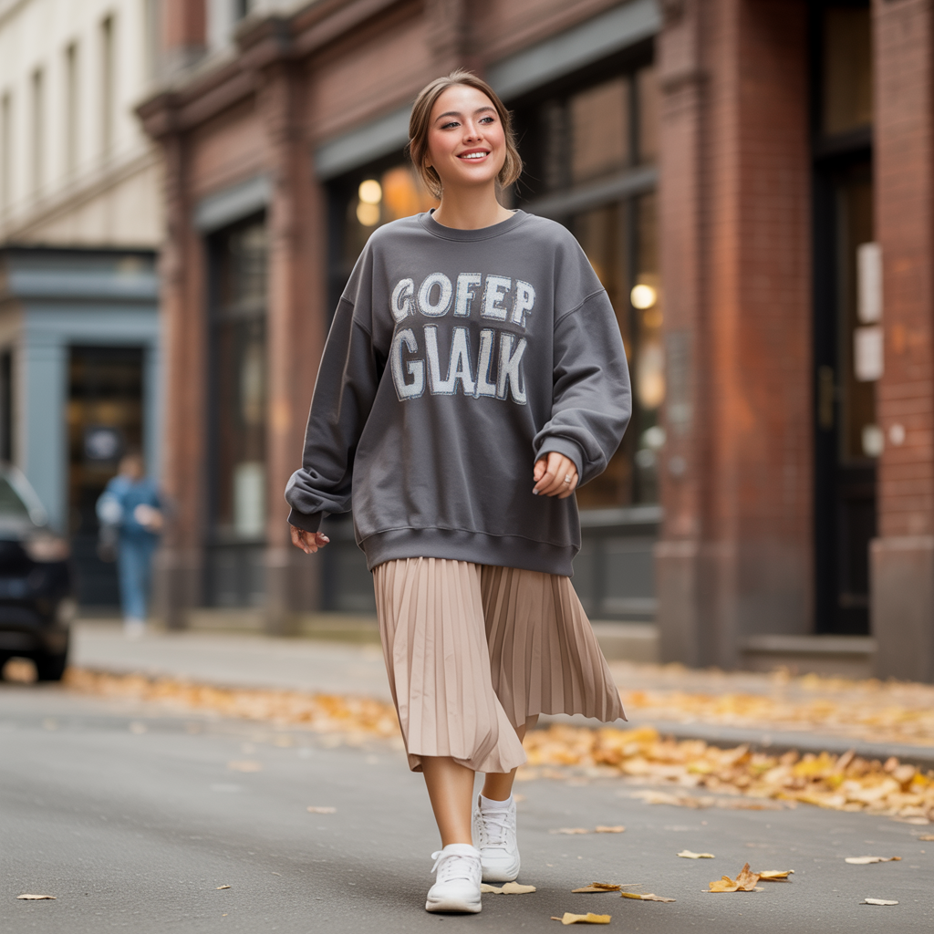 A graphic sweatshirt paired with a pleated skirt blends casual comfort with feminine structure. Sneakers keep the look relaxed and practical for daily wear. This outfit is youthful, cozy, and effortlessly trendy.