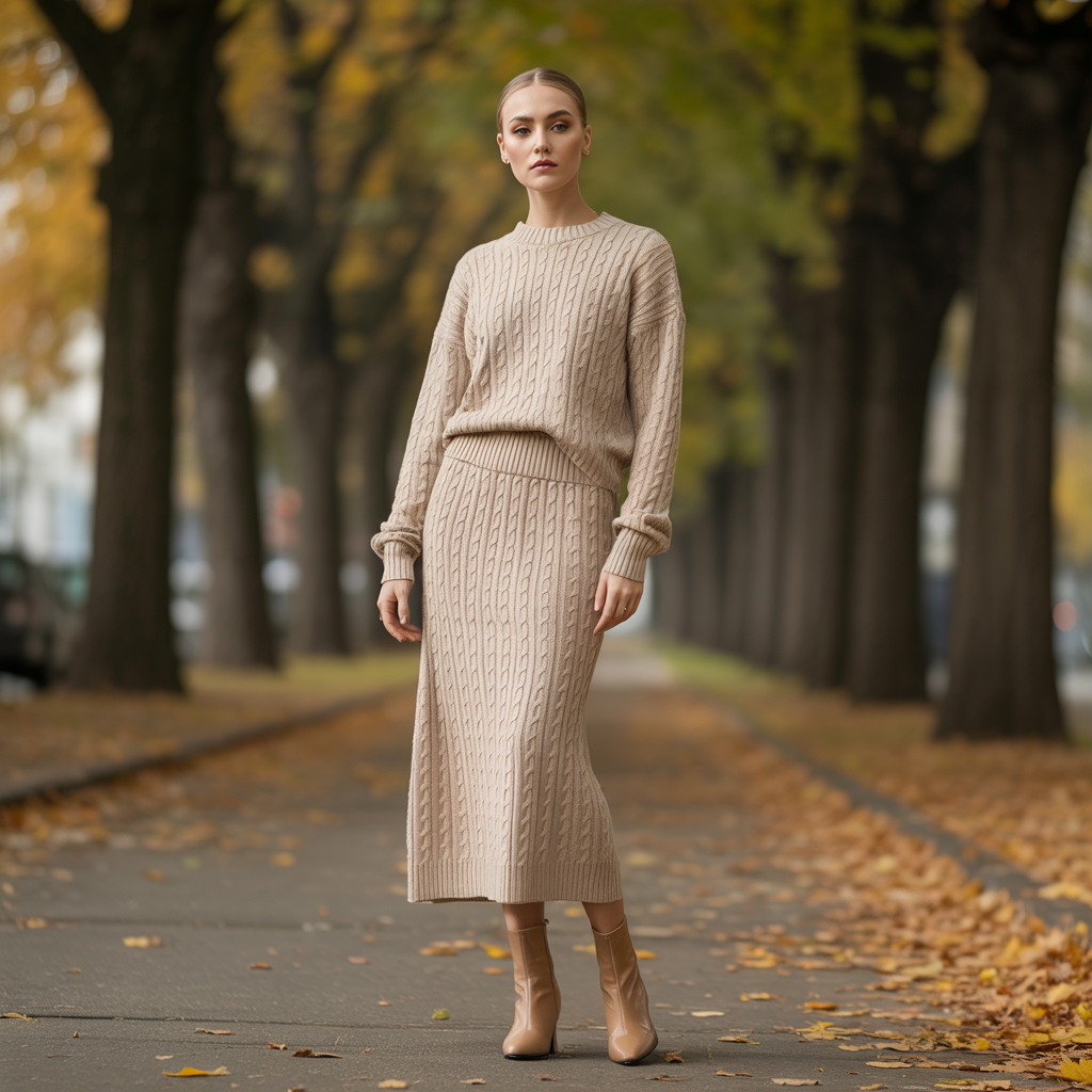 A knit co-ord set featuring a matching sweater and midi skirt creates an effortlessly chic fall look. The coordinated design simplifies styling while maintaining a cozy feel. It’s minimal, elegant, and perfect for 2026 trends.