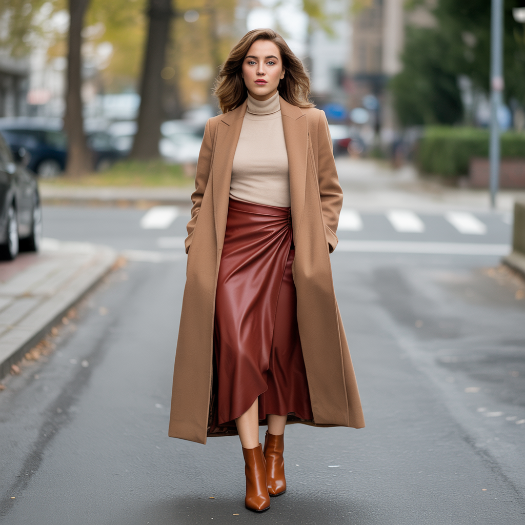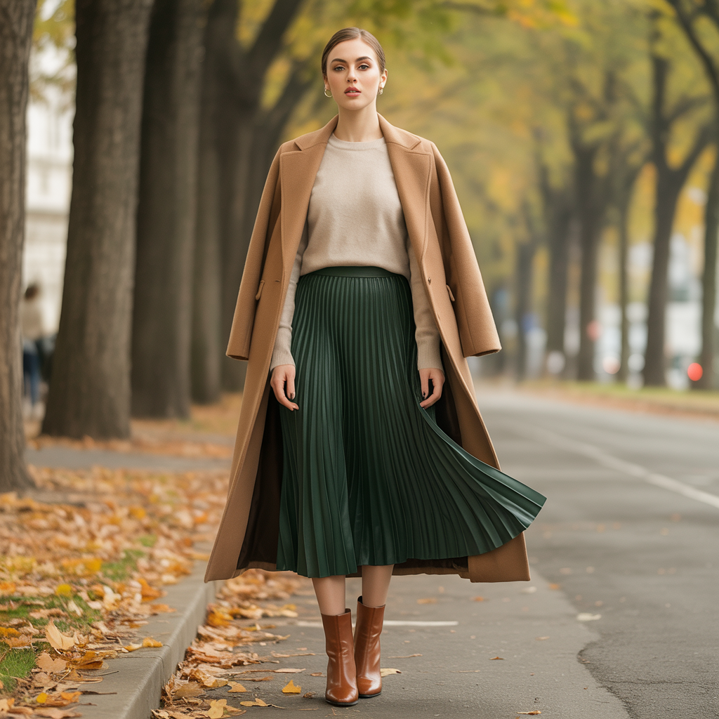 A pleated midi skirt combined with a fitted sweater creates a refined fall silhouette. Adding a belted coat enhances structure while keeping the outfit warm and cozy. This look feels elegant yet practical.