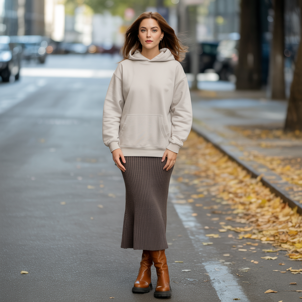 For ultimate cozy fall vibes, pair an oversized hoodie with a fitted knit skirt. Chunky boots add contrast and edge to the soft silhouette. This outfit blends comfort and street-style trend perfectly for 2026.