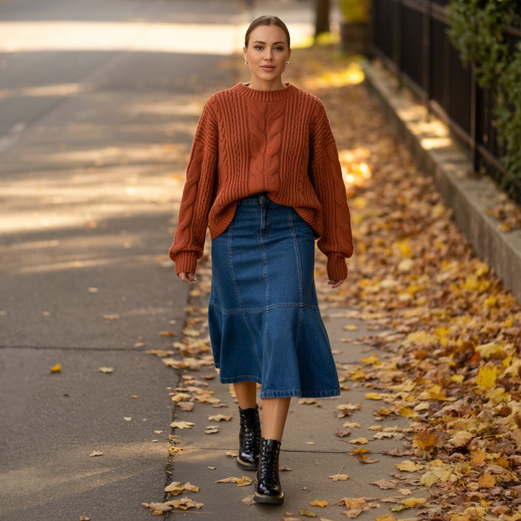 A denim midi skirt styled with a chunky knit sweater offers effortless fall comfort. Combat boots add a trendy edge and balance the softness of the knit. This outfit is practical yet fashion-forward for 2026.