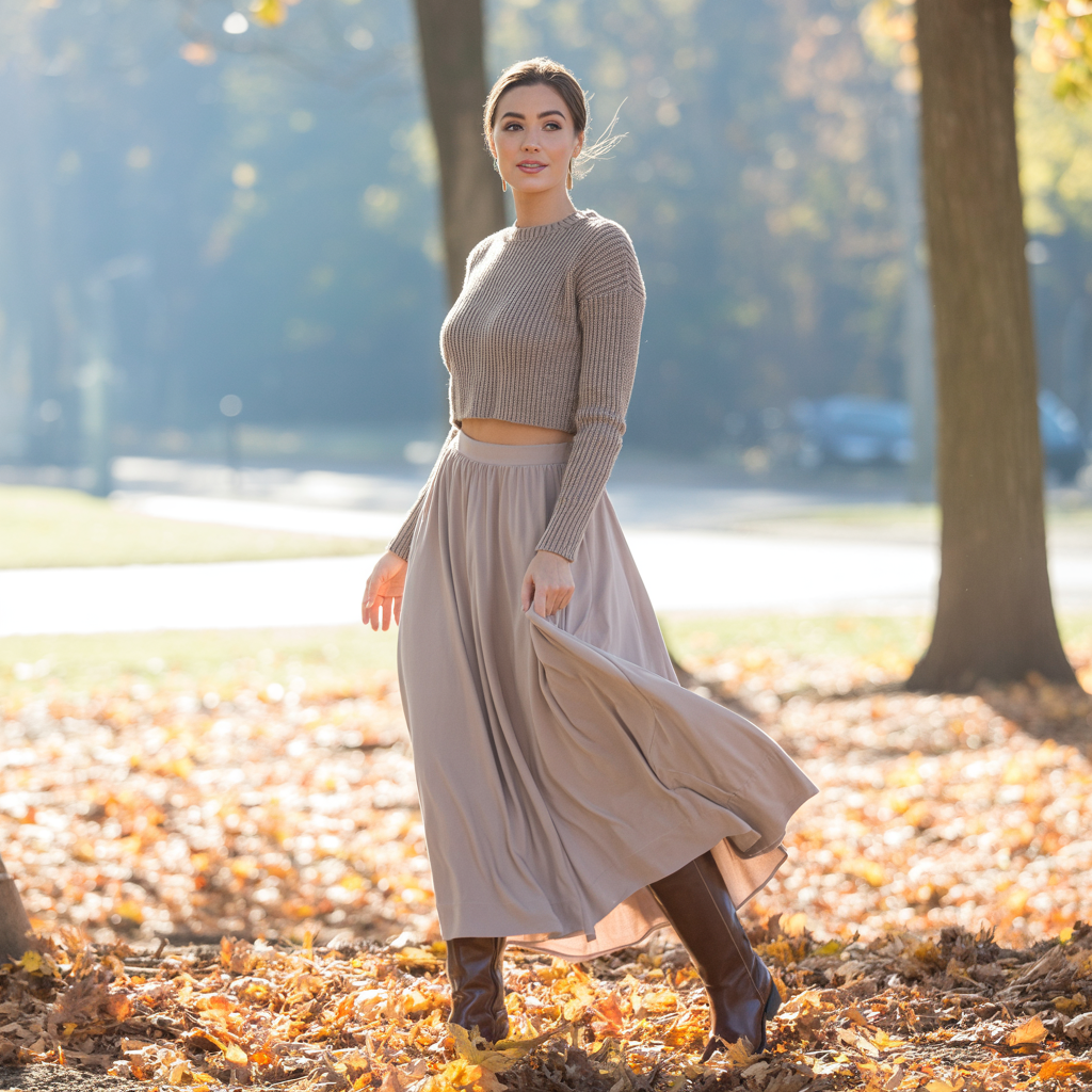 A flowing maxi skirt styled with a cropped sweater creates balance and warmth. Tall boots underneath add comfort and practicality for cooler fall days. This combination is relaxed yet fashion-forward.
