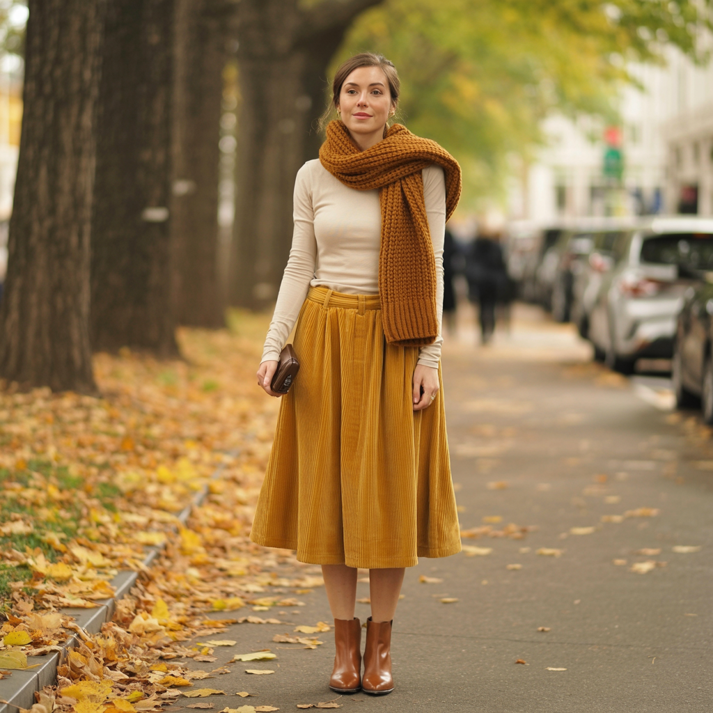 Corduroy skirts bring texture and warmth to fall 2026 outfits. Paired with a fitted long-sleeve top and a wool scarf, the look feels cozy and timeless. The ribbed texture adds subtle depth.