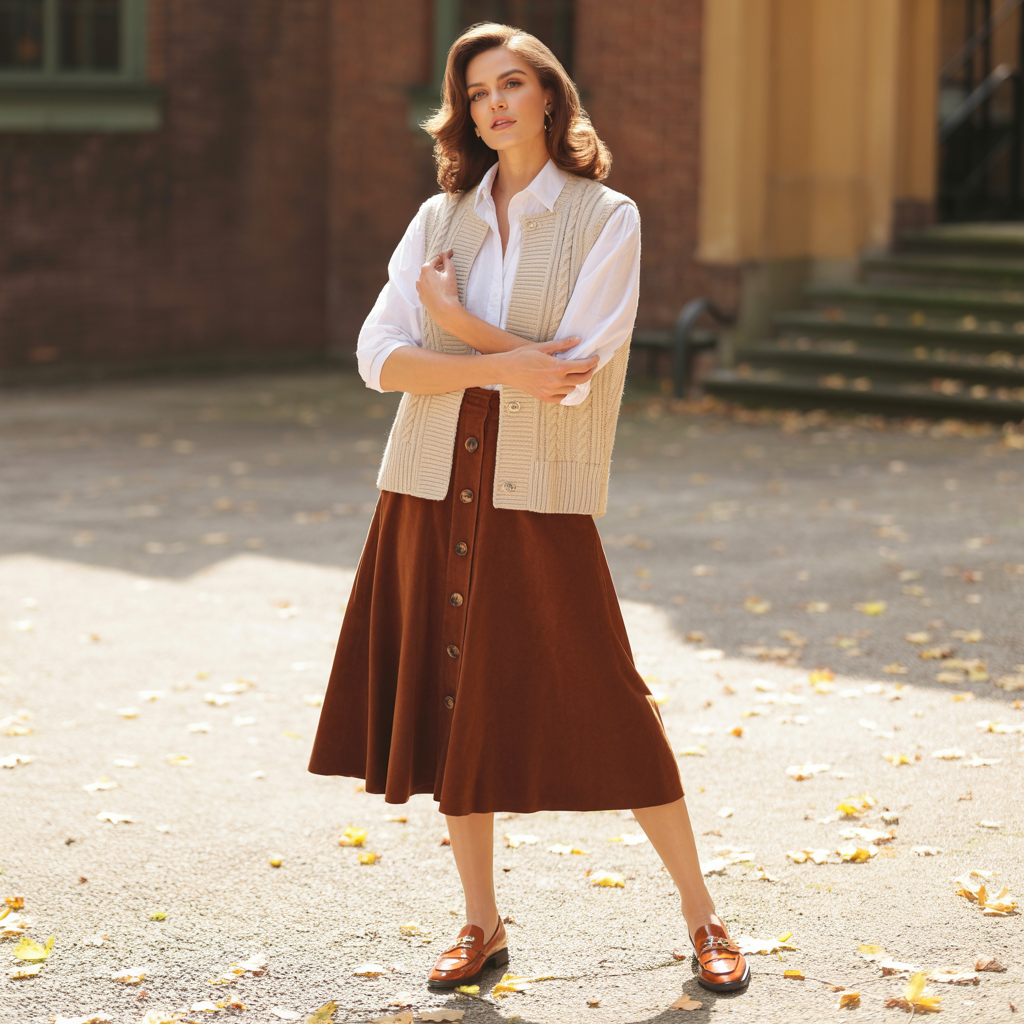 Layering a knit vest over a crisp long-sleeve top with a button-front skirt creates a smart yet cozy fall look. The structured buttons add vertical detail, while loafers keep the outfit polished and comfortable. This combination feels preppy and modern for Fall 2026.