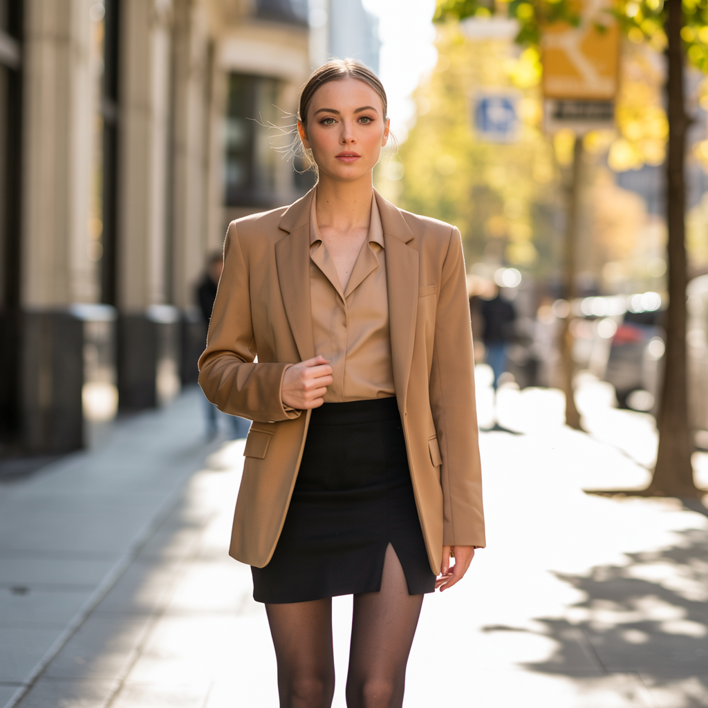 A tailored blazer worn over a mini skirt instantly elevates your fall wardrobe. Adding sheer or opaque tights provides warmth while keeping the look sleek. Ankle boots complete this trendy, city-ready outfit.