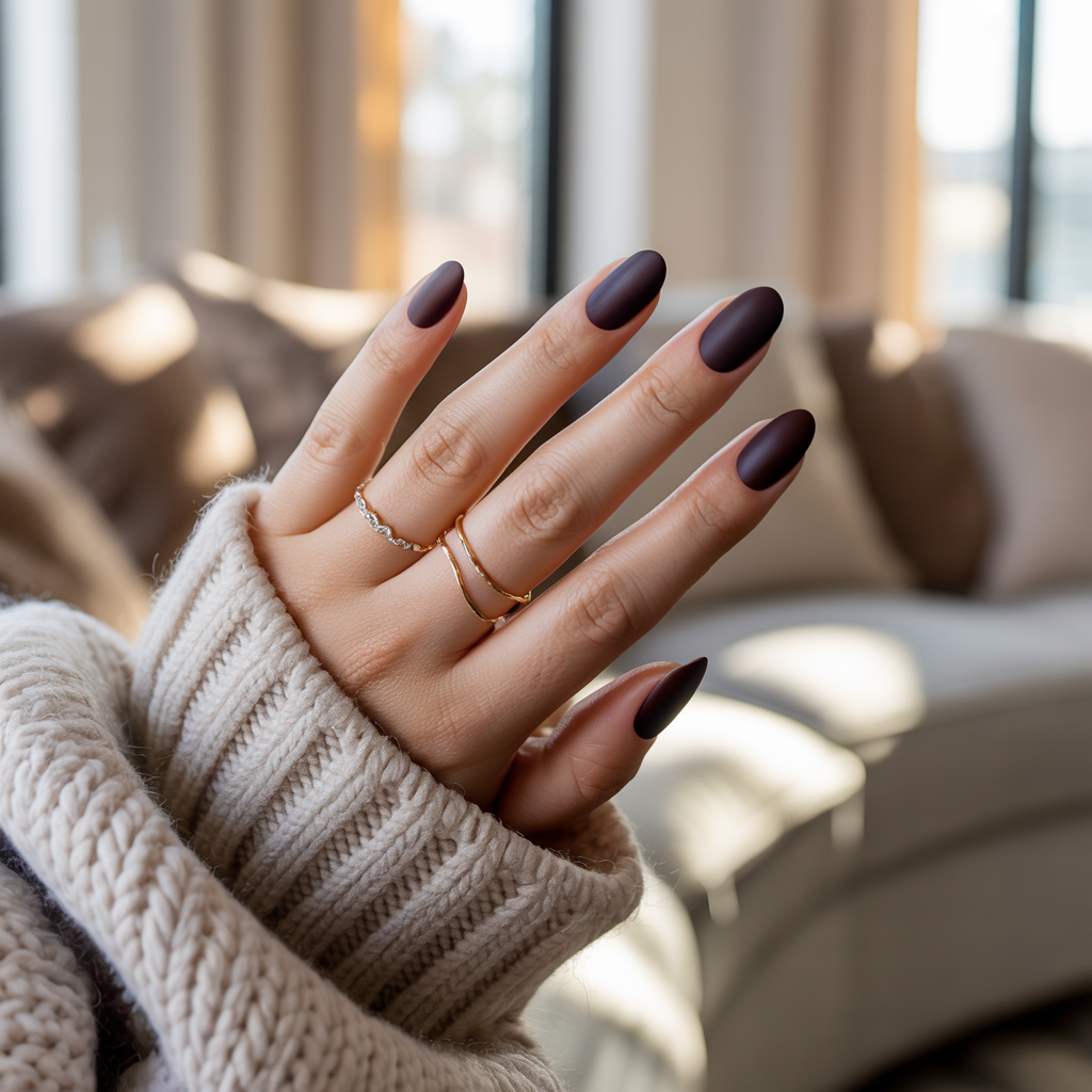 Deep matte brown-black with an ultra-fine satin sheen mimics the specific low-reflective quality of genuine leather. Not fully matte, not remotely glossy the exact finish of a well-worn leather jacket. No art required. Just a finish technique that most people have never seen done properly on nails, and the result is one of the most quietly striking looks of the season.