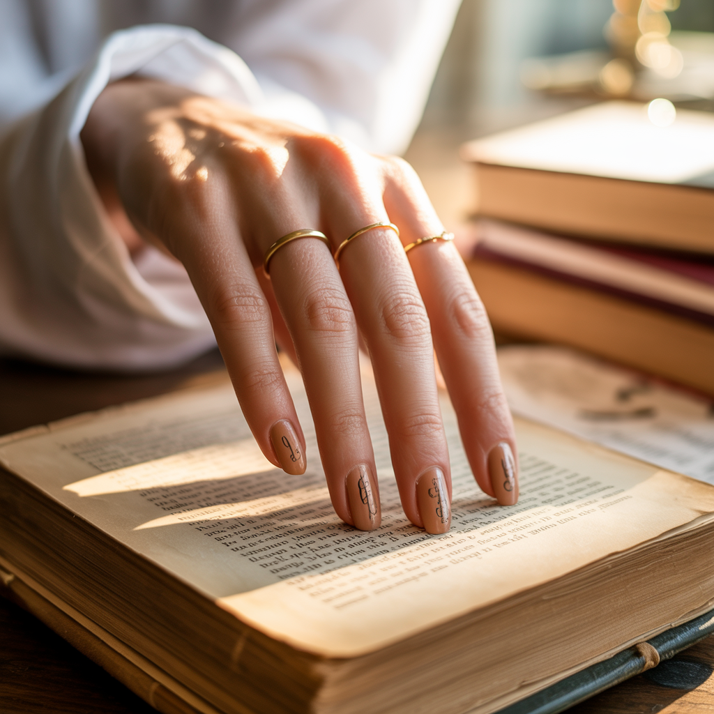 A warm parchment-beige base with extremely faint, almost imperceptible handwritten line details resembling old book paper without readable text. From a distance it reads as a warm sophisticated neutral. Up close it is detailed, literary, and completely original. The academic aesthetic is building steadily on Pinterest and this nail sits right at the centre of it. It is the kind of manicure that makes people ask what it is.