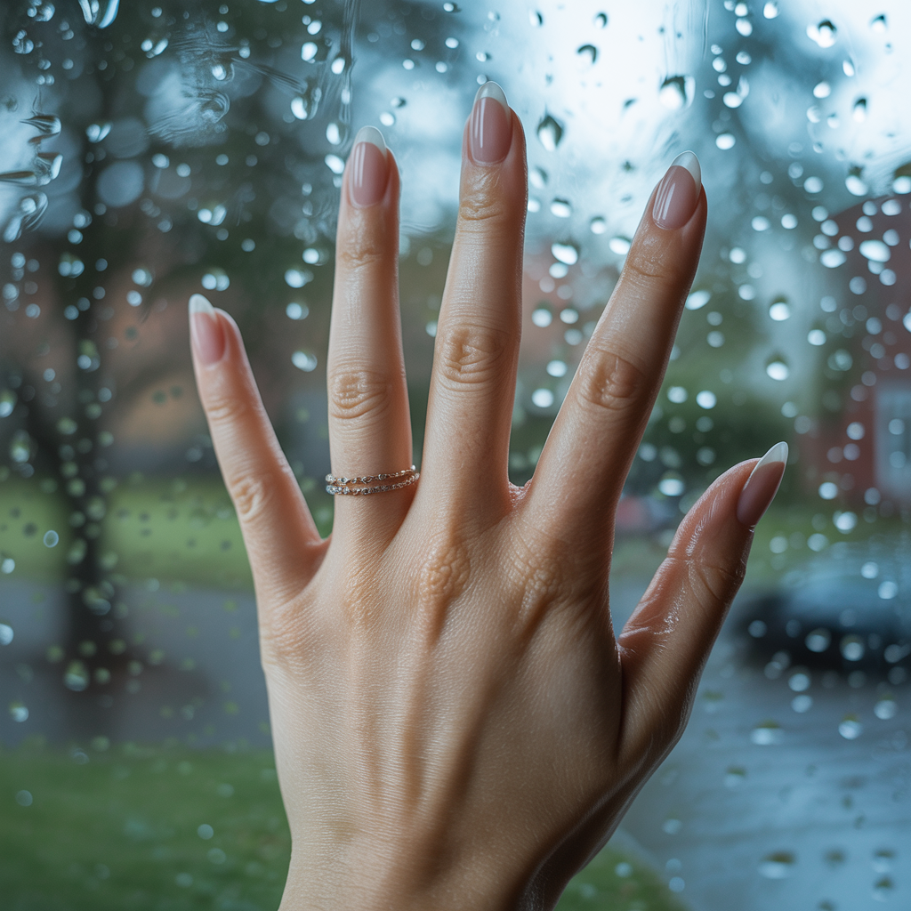 Clear gloss nails with scattered tiny translucent dots suspended under the topcoat mimicking raindrops on glass. Almost invisible at arm’s length but extraordinary up close. In photographs it looks like genuine condensation on a window. It is one of those designs that makes people look once, look again, and then say ‘wait what is that?’ Which is the most satisfying reaction a nail design can produce.