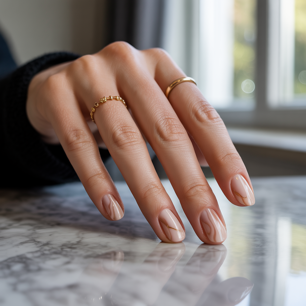 Every marble nail you have ever seen uses white or grey. The warm stone version uses a sandstone-beige base with subtle caramel or tan veins more river stone than Italian marble, more earthy than glamorous. A complete reimagining of a familiar design in a palette that actually feels like the season. Consistently generates the ‘what nail colour is that?’ reaction because people cannot quite place it.