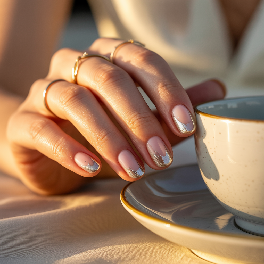 A small diffused golden shimmer placed at the centre of a pale warm nude base mimics the reflection of candlelight on a fingernail. In direct light it catches and glows warmly. In softer light it barely registers just a quality that makes the nail look more alive than a plain nude. Simultaneously the most minimal and most atmospheric design on this list.