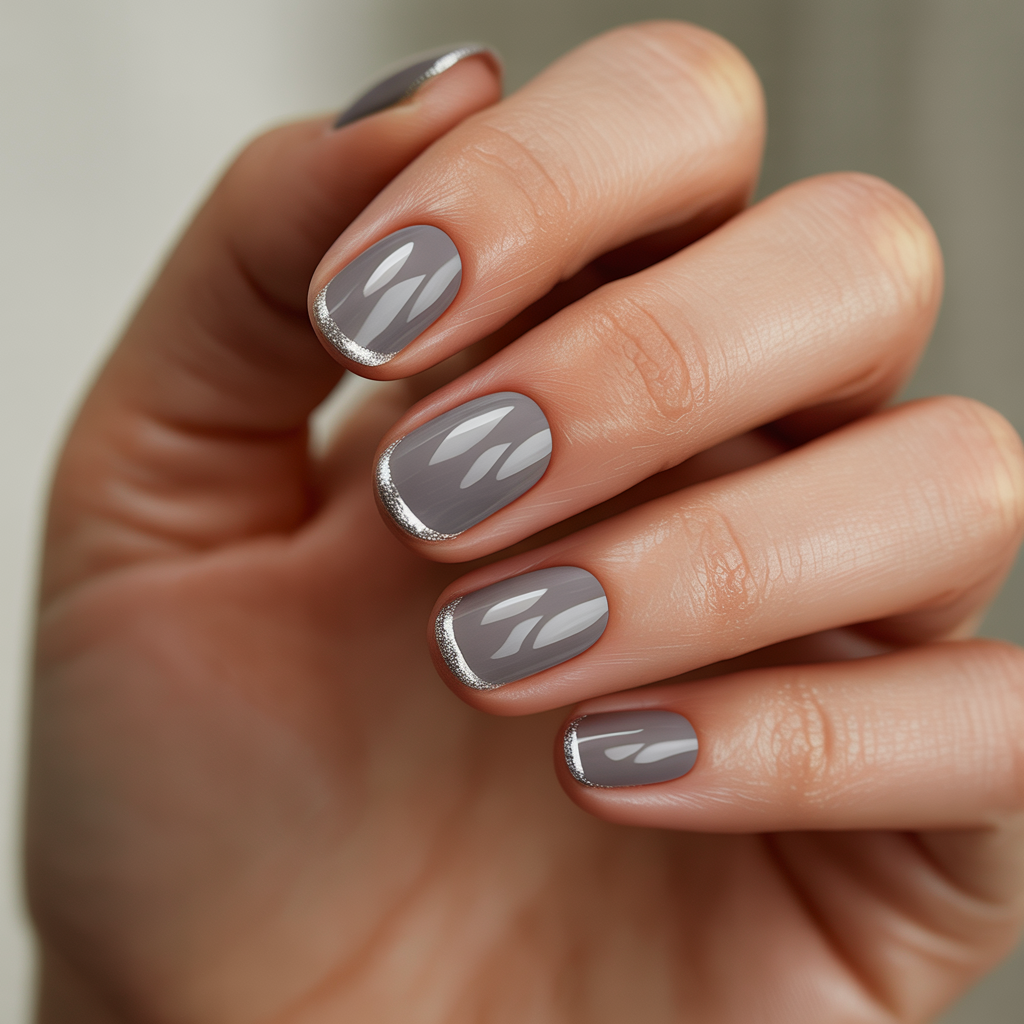 The nail interior stays a soft translucent smoky grey while a whisper-thin metallic line traces the oval edge. The reflective border catches light as your hand moves. The smoky centre stays misty and atmospheric. Interesting in photos, understated in person that balance is genuinely hard to achieve and this design does it effortlessly.