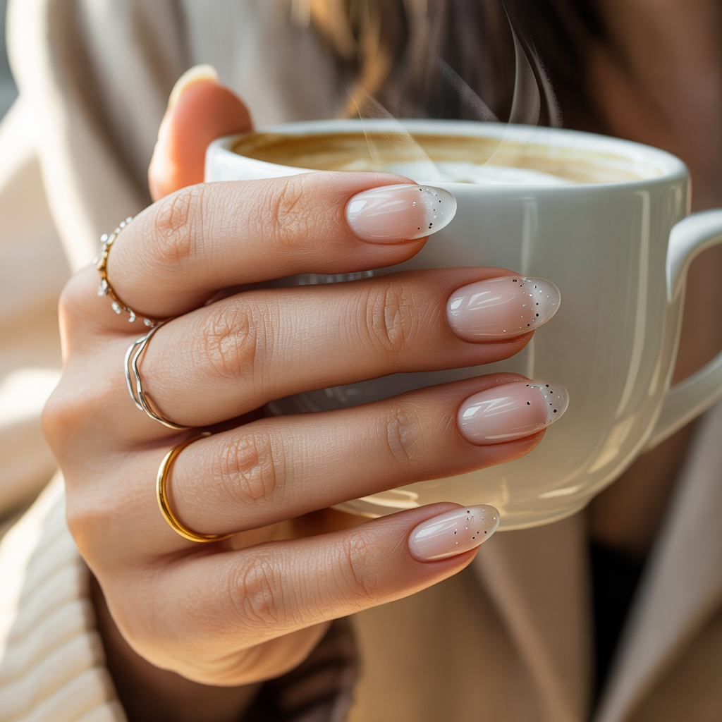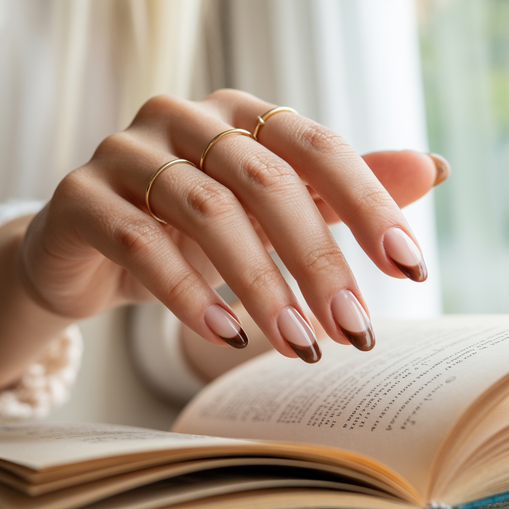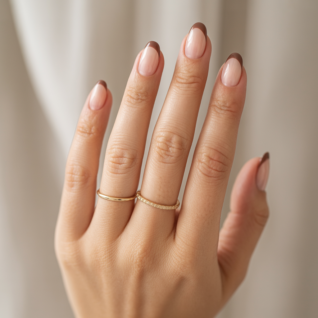 A mocha or espresso tone that fades into the nail plate like a shadow rather than a defined line. The result is a French manicure that reads as sophisticated and barely-there nothing like the stark white tips of its predecessor. On oval nails it creates a beautifully refined silhouette. It is the nail equivalent of contouring: shape without a visible technique.