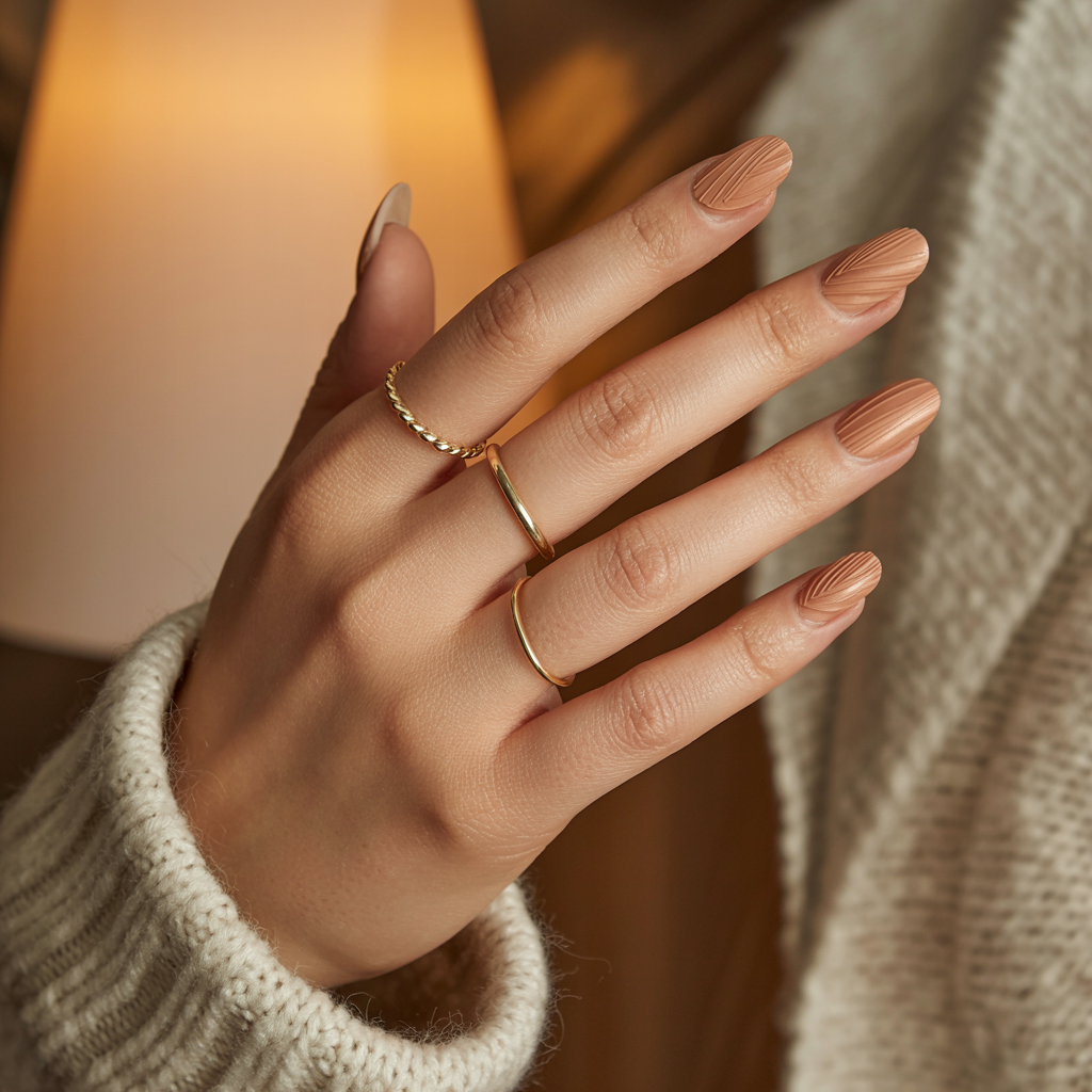 Ultra-fine vertical lines in a slightly darker tone over a matte neutral base create the visual illusion of corduroy or ribbed knit. Up close the lines are intentional and detailed. From a normal viewing distance the nail just looks richly textured in a way that is impossible to fully explain. It rewards close inspection without requiring it the hallmark of great minimalist nail art.