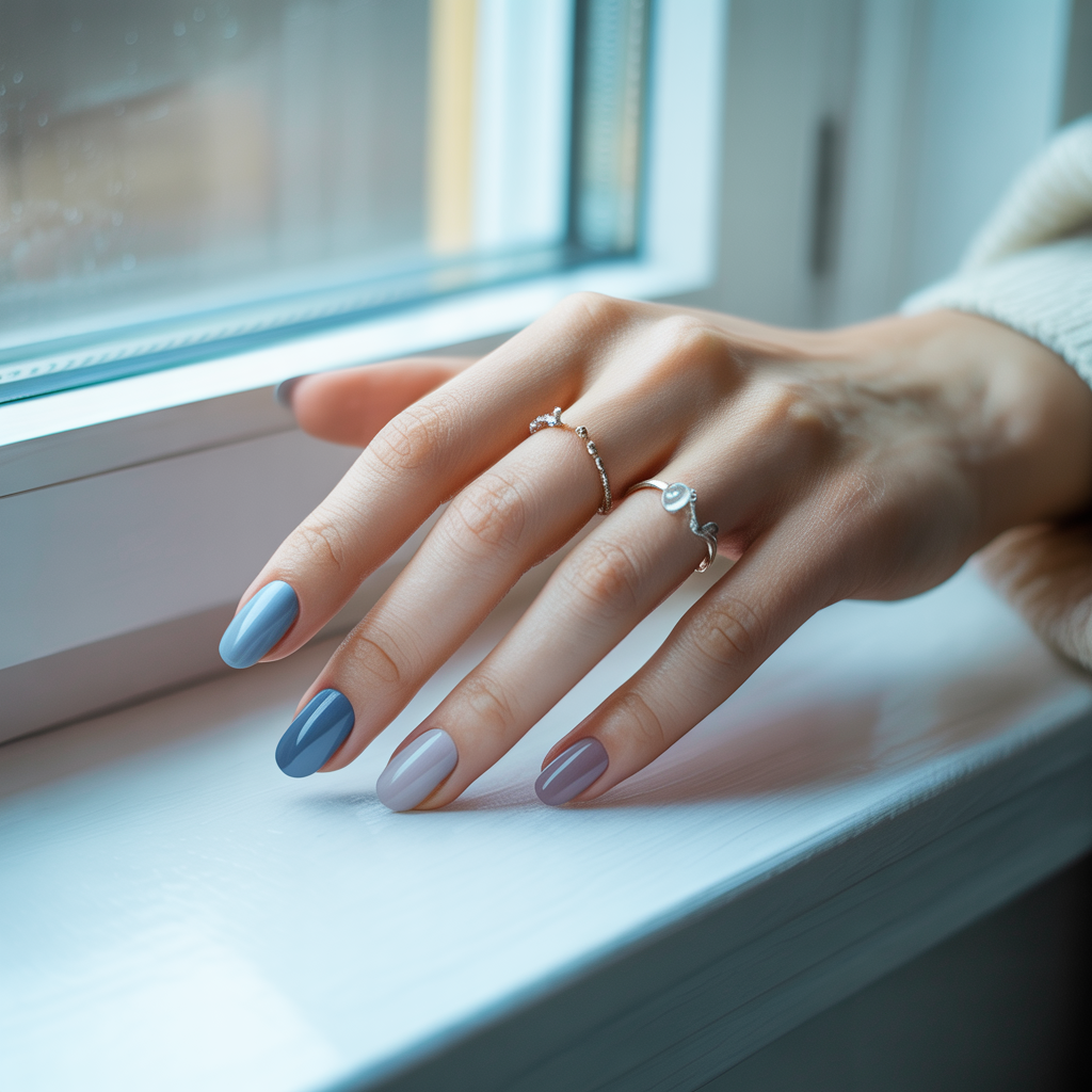 Technique tip: Work quickly with a gradient sponge start with deeper dusty blue at the cuticle, fade toward lavender-grey at the tip before the polish becomes tacky.