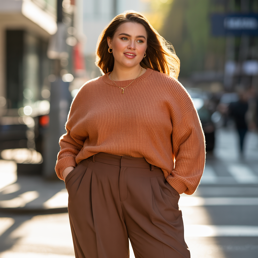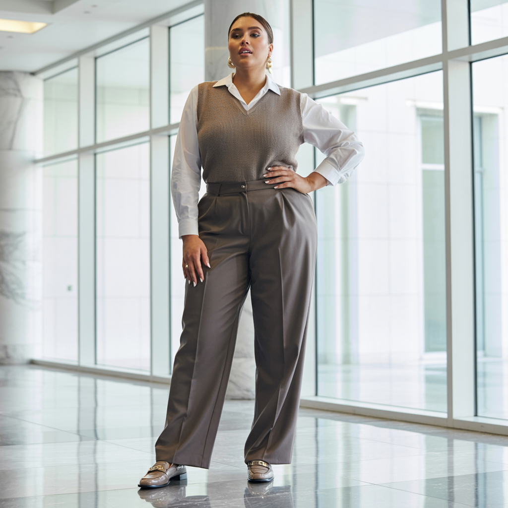 The sweater vest trend continues into Fall 2026, offering structured layering for plus size fashion. Paired with tailored pants, it creates a refined yet cozy look. The layered dimension adds visual interest.
