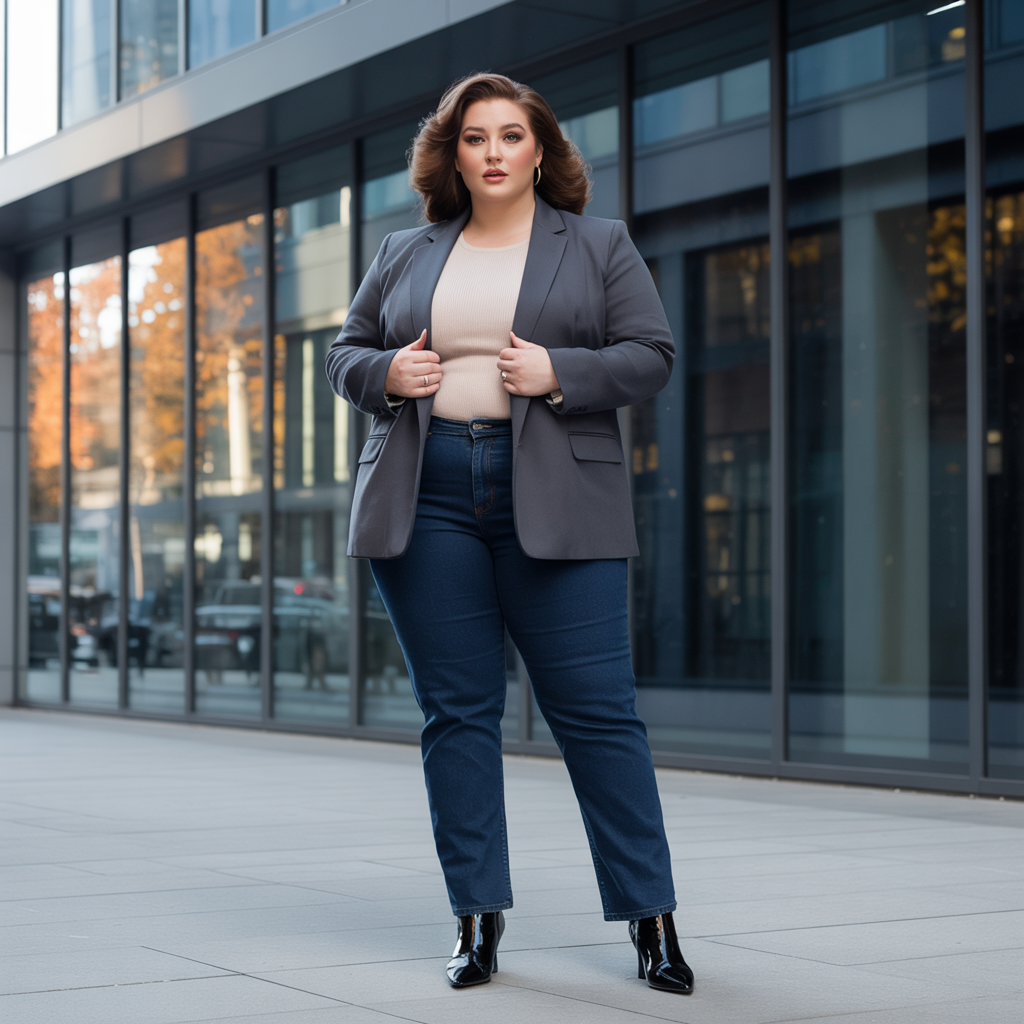 A tailored blazer paired with dark straight-leg denim creates a smart yet cozy fall look. The structured blazer adds sophistication, while denim keeps the outfit relaxed and wearable. This pairing is ideal for achieving a balanced silhouette.