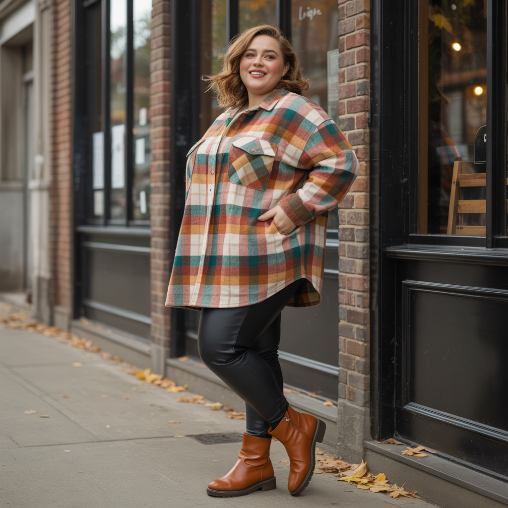 Earthy plaid tones elevate the seasonal vibe. The structured shacket balances the fitted leggings beautifully. This look is practical, cozy, and perfect for everyday fall styling.