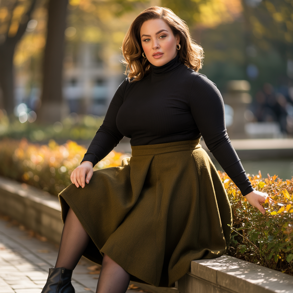 A fitted turtleneck paired with an A-line skirt creates a flattering hourglass shape. The fitted top defines the upper body, while the skirt adds gentle structure. This outfit feels both classic and cozy.