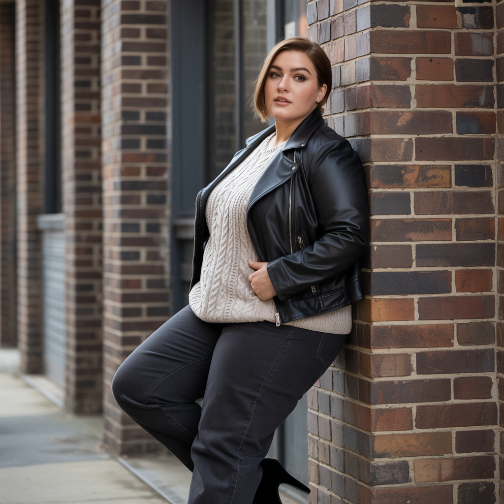 A leather jacket layered over a soft sweater with straight-leg jeans adds edge to cozy fall styling. The structured outer layer contrasts beautifully with knit textures. This look balances bold and comfortable elements.